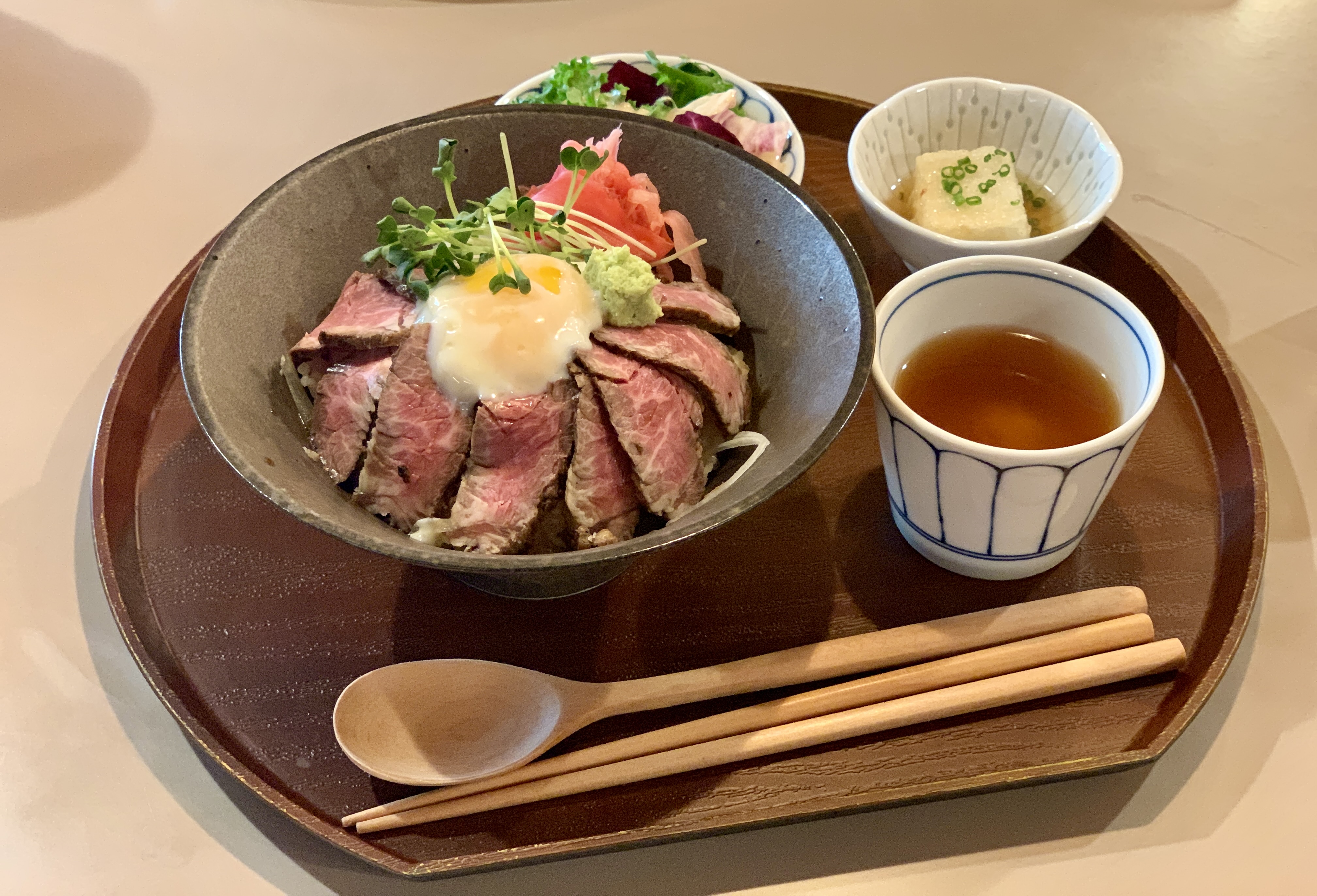깍두기, 샐러드(깨소스), 연두부튀김, 장국