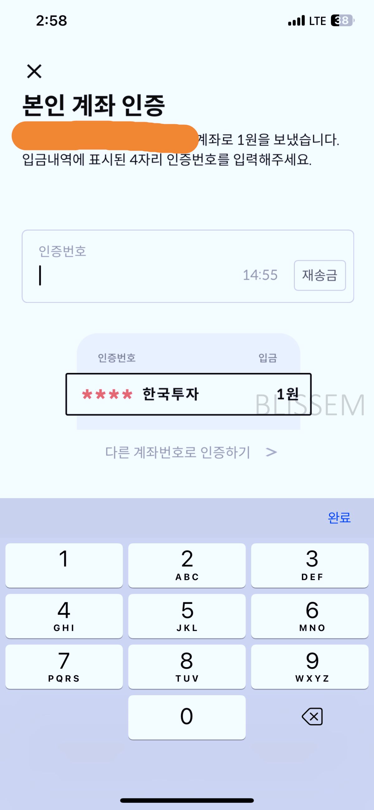 내 계좌 번호를 입력하면 1원이 입금되면서 ****한국투자라고 입금이 됩니다.